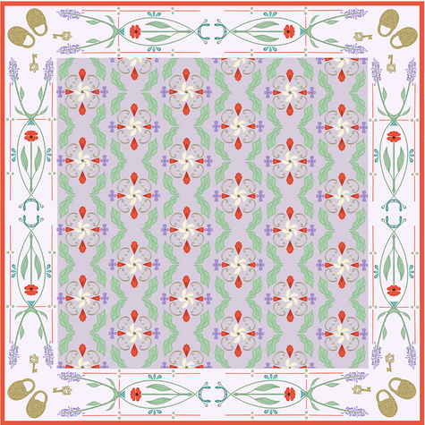 While studying abroad I was very drawn to the florals and the architecture of France. I wanted to keep a consistent color palette and style. Symmetrical layouts inspired by the buildings in the city and florals from the country side fields. Imagining these designs printed on silk scarves for the luxury feel and market. I started most of my process through hand drawn motifs, then worked digitally to achieve the symmetrical composition.